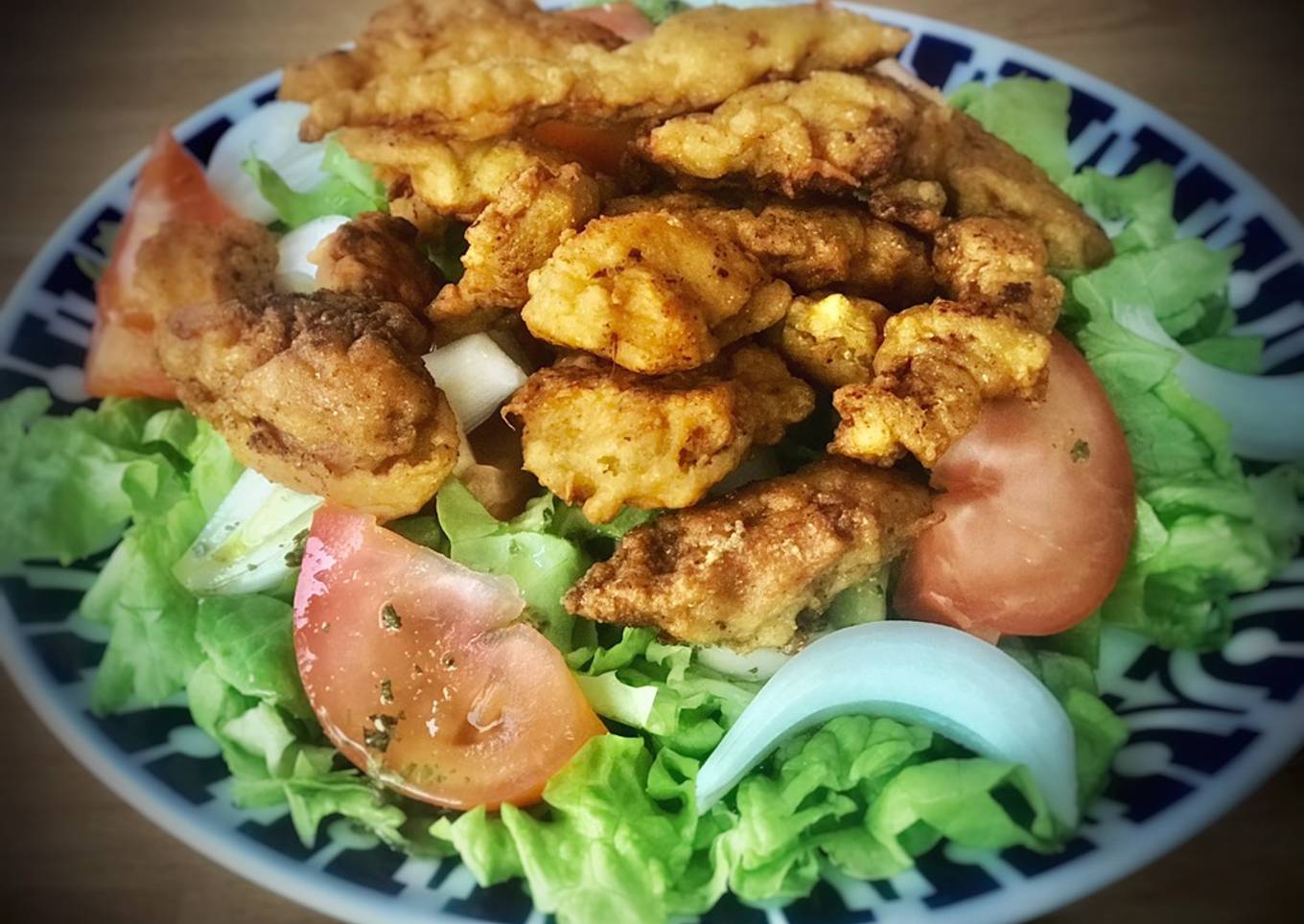 - Servimos las tiras de pollo crujientes con la ensalada y su ali帽o por debajo.