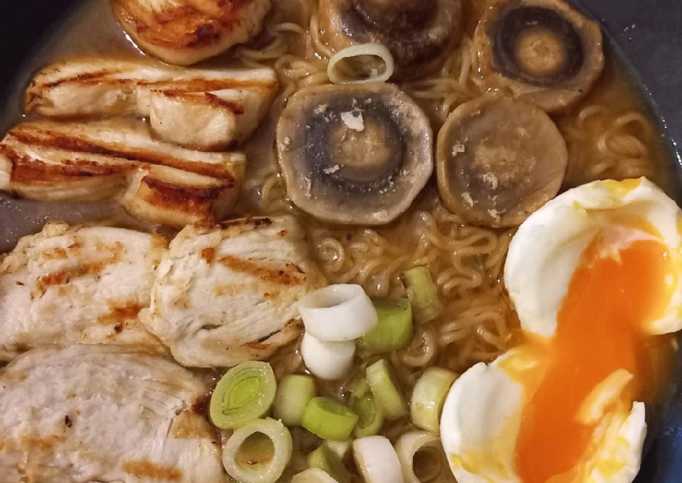 - Saltear en un sartén los champiñones cortados en círculo y los ajos tiernos por separado.Una vez el pollo listo retirarlo del caldo y agregregar los noodles 2 o 3 minutos como indica el paquete. Al mismo tiempo hervir los huevos 4 minutos nada más. Para que quede la yema líquida y la clara cuajada. Pasados los 4 minutos cortarles la cocción en agua fría.