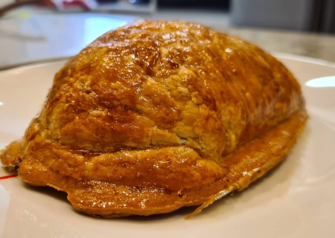 - Ahora simplemente envolvemos con el hojaldre todo, recortamos el exceso de hojaldre y hacemos unas dobleces para sellar lo. Pintamos el hojaldre con la yema de huevo. Lo llevamos al horno y dejamos que se haga unos 40-45 minutos o hasta que veáis que el hojaldre está bien doradito. Sacamos del horno y servimos caliente.