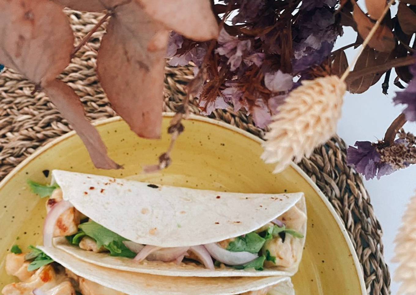 - Encima de cada tortilla de trigo ponemos lechuga y encima el pollo con el maíz, la cebolla y el queso.