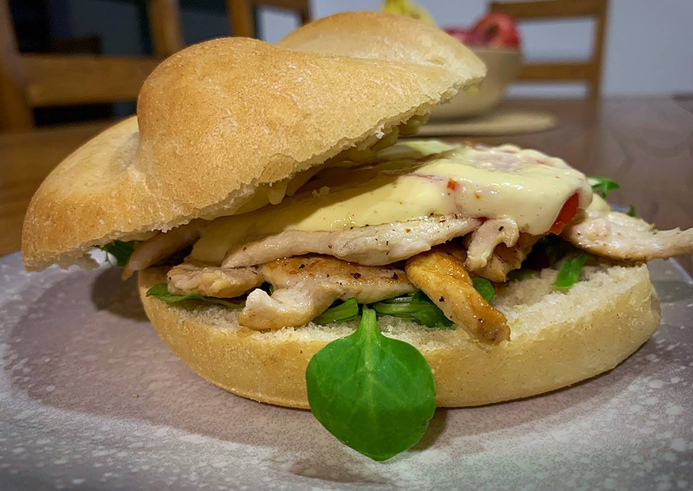 Steps to make to make Bocadillo de pollo con alioli de azafrán y manzana