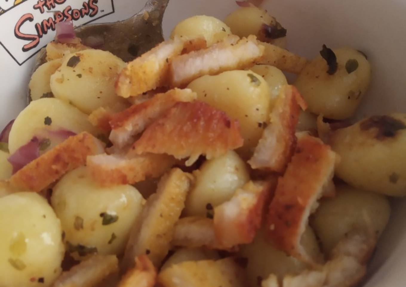 - Cuando la cebolla se haya tostado añadimos los gnocchis cocidos y ponemos especias al gusto: sal, pimienta, orégano, ajo en polvo. Removemos unos pocos minutos para integrar bien las especias y que los gnocchis se pongan doraditos.