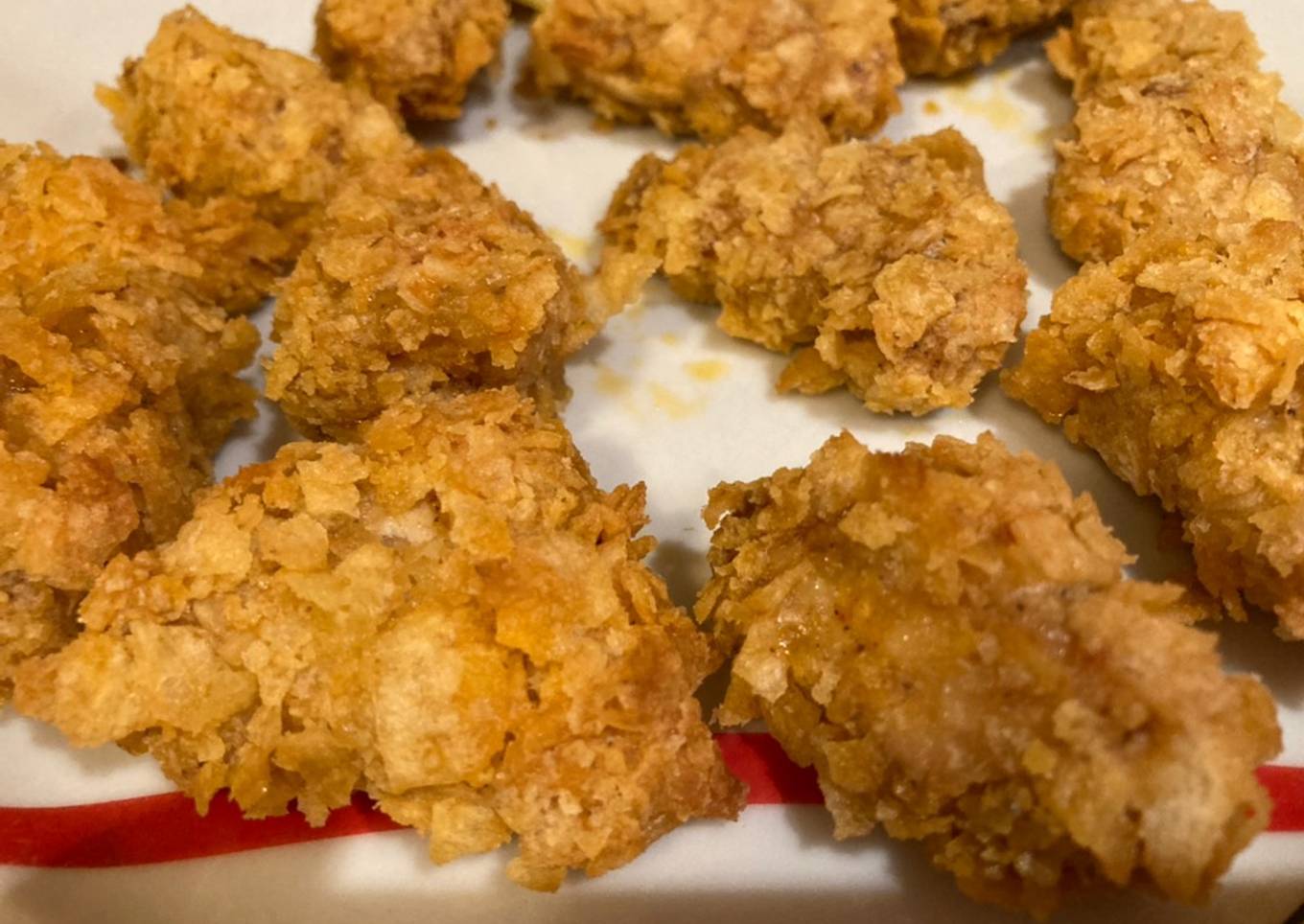- Lo primero pasamos los trozos de pollo por harina, luego por huevo batido y por último empanamos con patatas trituradas.