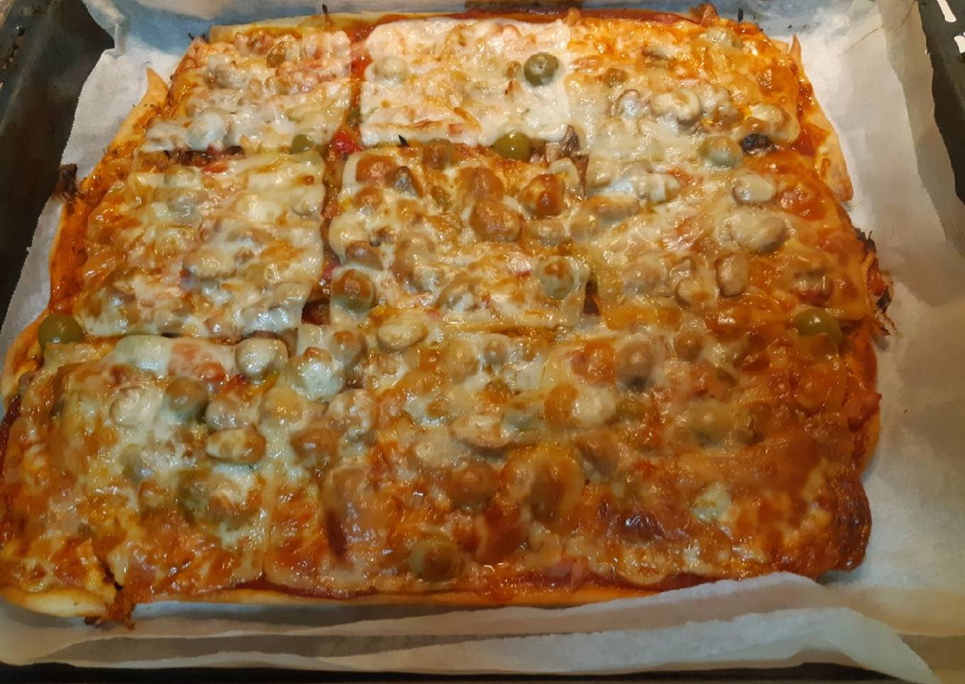 - Se le añaden todos los ingredientes. Pechuga pavo embutido, atún, bacon, pimiento rojo, verde, amarillo, champiñón, queso olivas verdes y al horno. Aprox 180 grad 30 a 40 minut