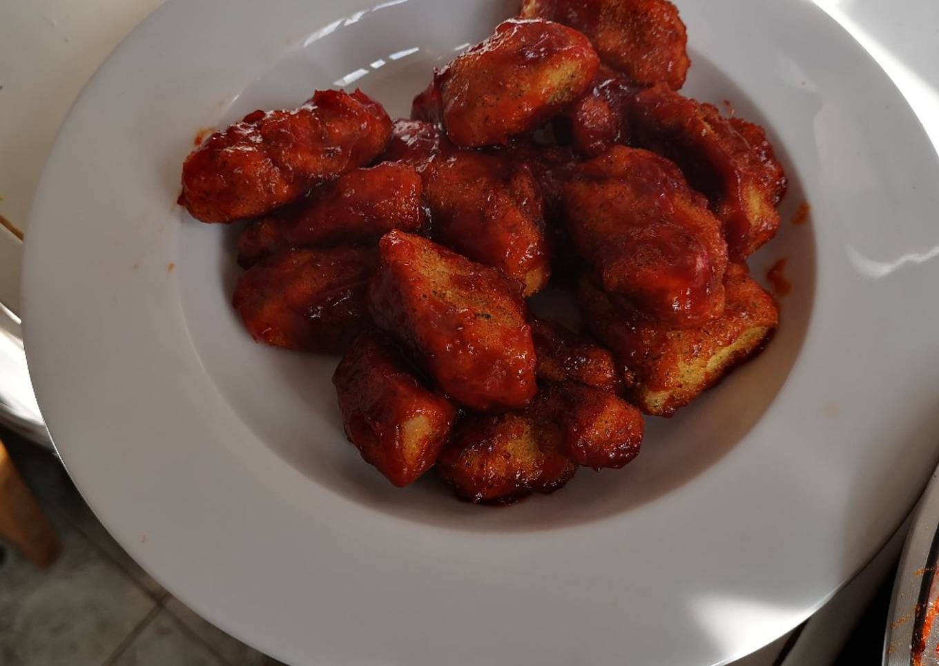 - En otra sartén a fuego medio, ponemos la salsa barbacoa y vamos echando todos los trocitos en varias tandas y salteamos, hasta que estén colorados 😉. Echamos más salsa barbacoa a medida que se vaya necesitando.