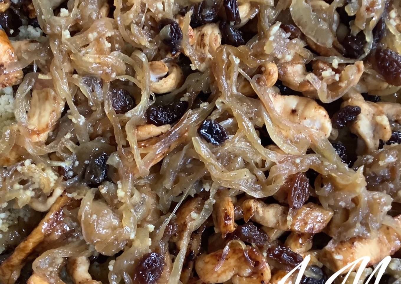 - Para presentar el plato coloca en la base el cuscús, las tiras de pollo y la mezcla de cebolla y pasas por encima. Yo lo he hecho alternando, para que coja todo el sabor, ya como más guste.