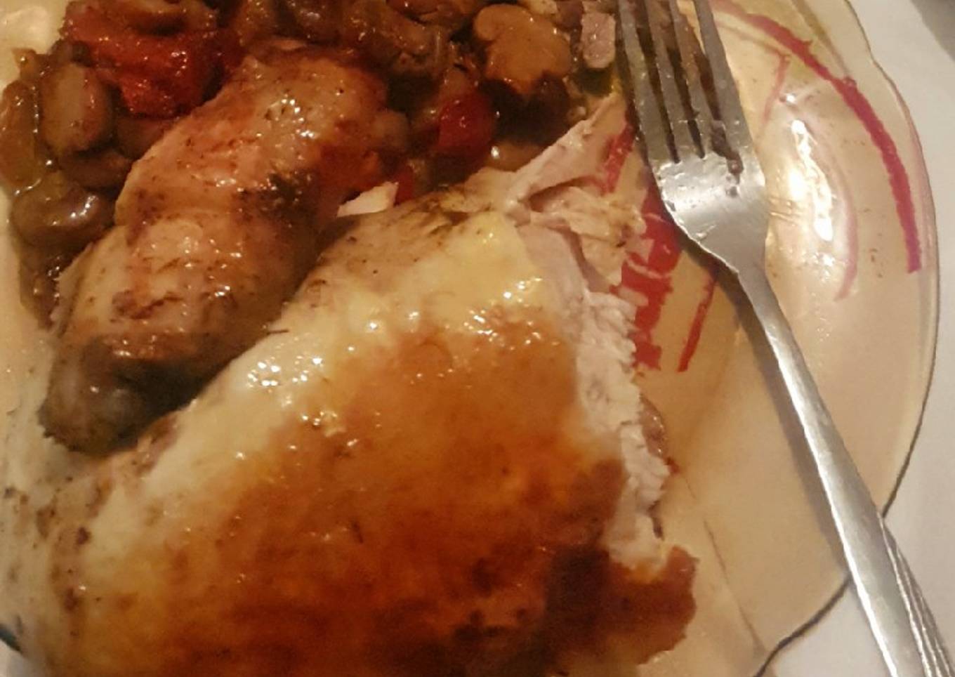 - Nota: Posiblemente cuando el pollo empiece a hacerse los pinchos se suelten al dar vueltas yo lo que hice es sacarlo y volver a pincharlo. Una vez que vi que estaba echo lo solté del rustidor y lo deje en la bandeja para que se dorara (ya que quería que quedara crujiente por fuera).