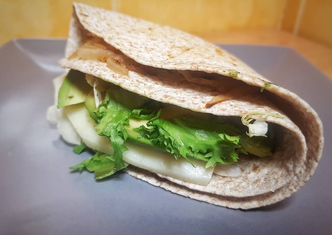 - Cortamos la tortilla del centro al borde y rellenamos un cuarto con la pechuga de pollo, otro con la cebolla, otro con el aguacate y otro con las lechugas y el queso