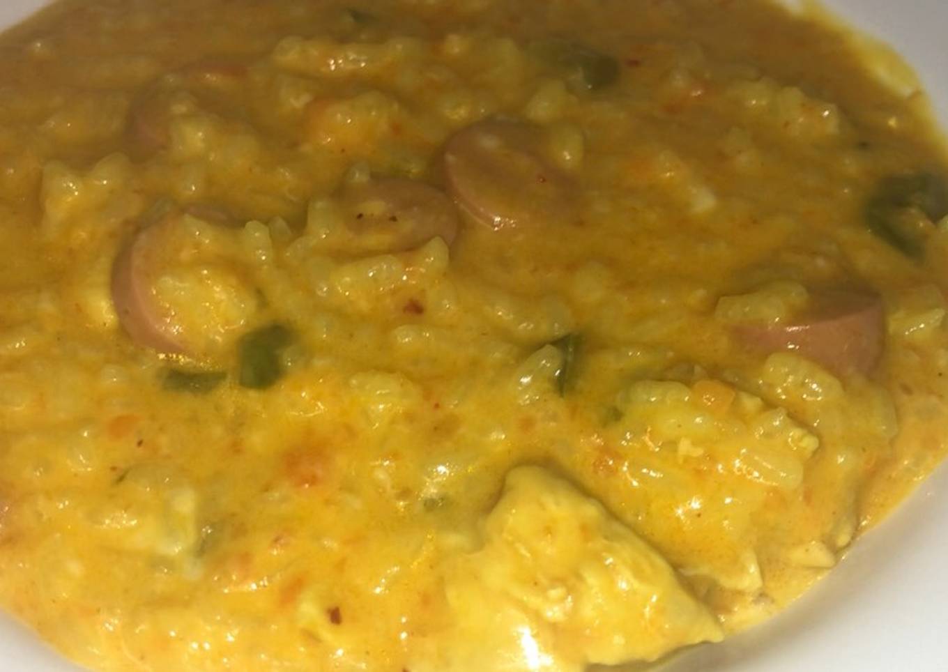 - Cocinar 16 minutos hasta que esté el arroz. Y por último agregar la nata, la mozzarella y las salchichas que se hacen muy rápido