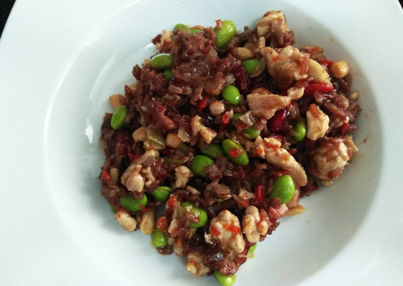- Una vez se ha disuelto el caldo, agregar edamame, pasas, arándanos y cacahuetes.