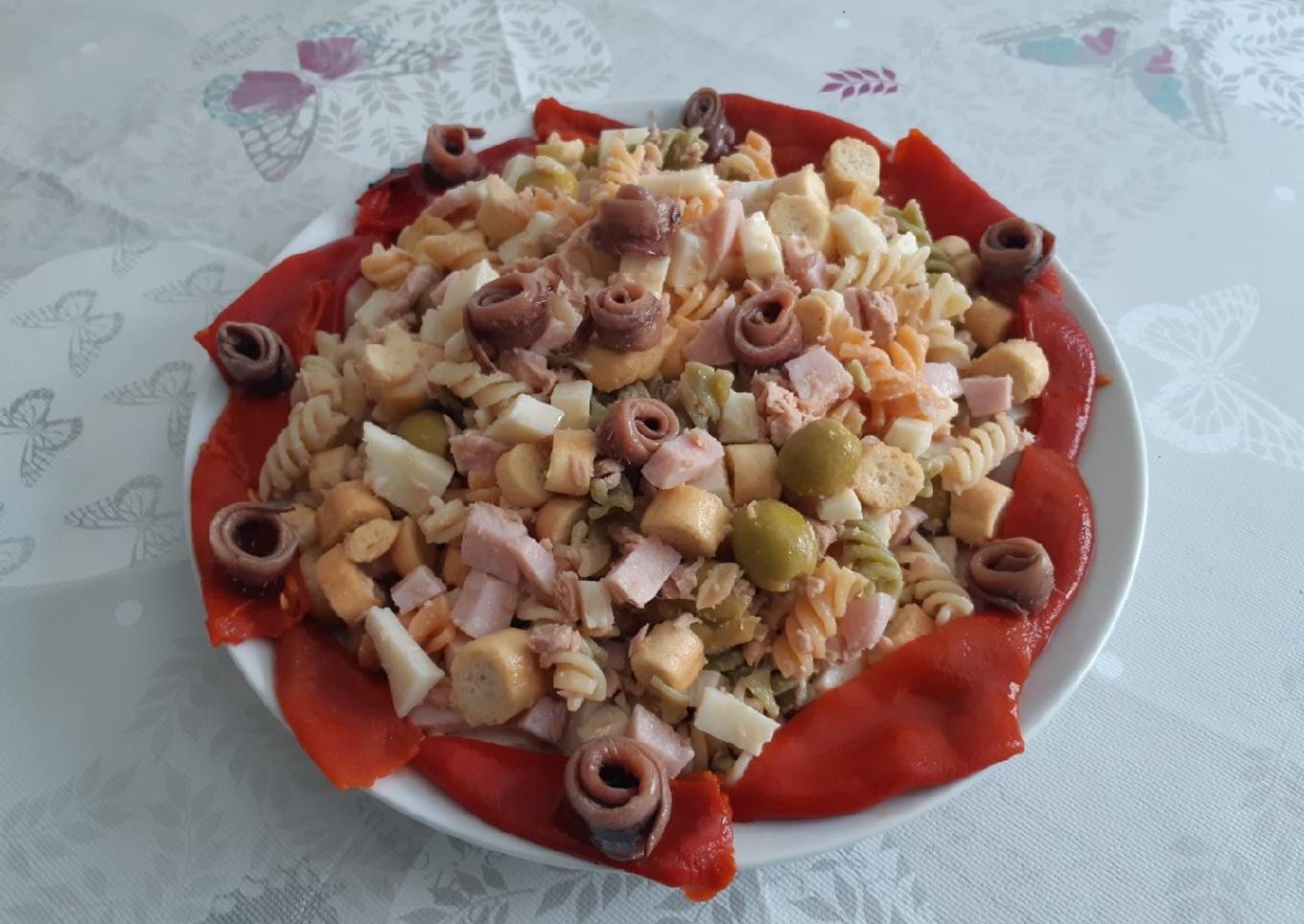 Ensalada de hélices de color con piquillo y anchoas