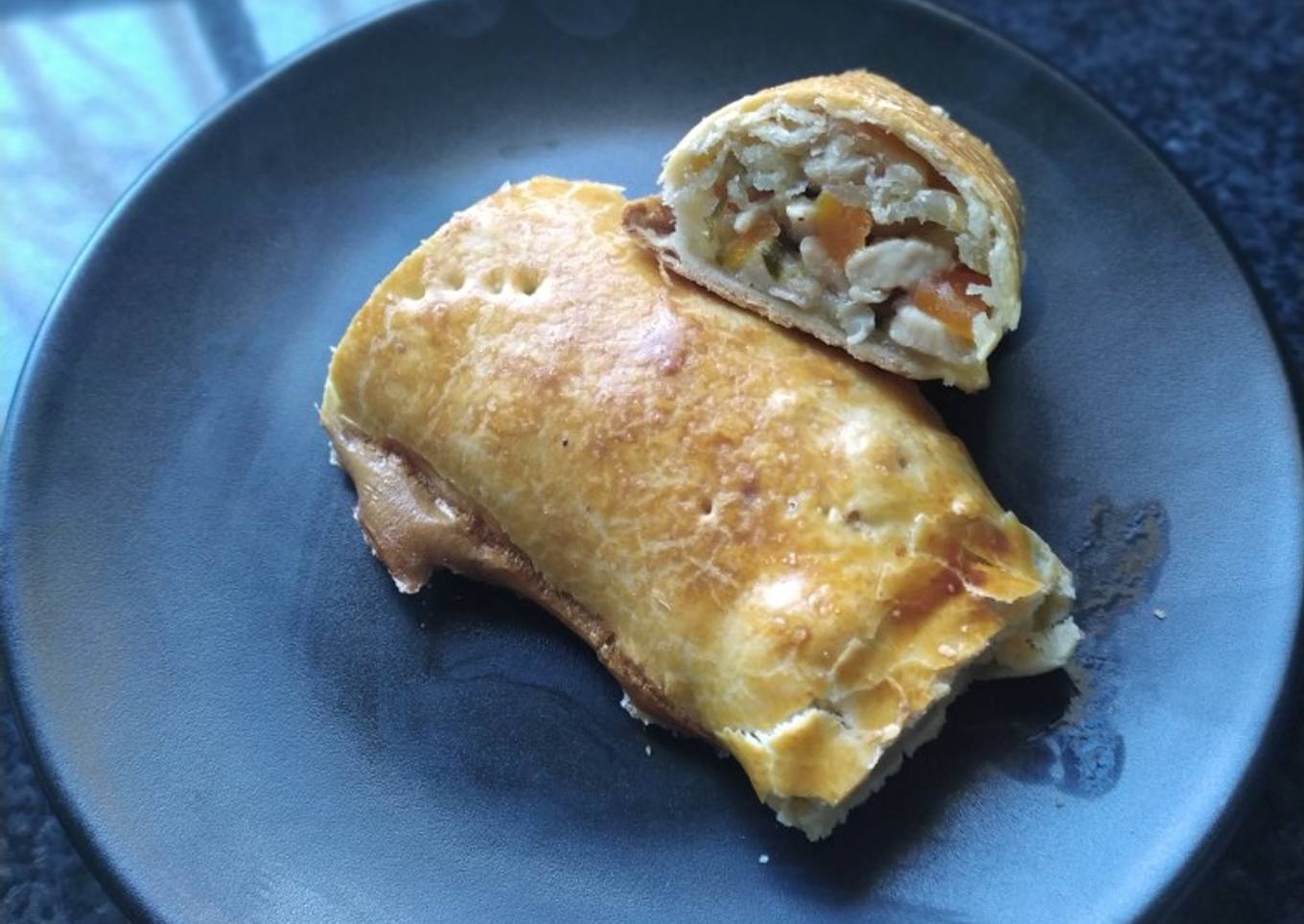- La pasta quebrada se extiende en la encimera, se rellena de los alimentos cocinados y se envuelve.