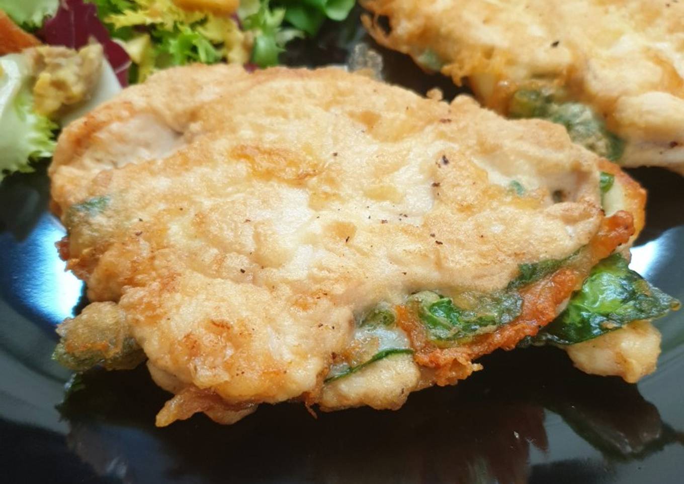 - Salpimentar los filetes. En cuatro de ellos poner una capa de espinacas, encima dos triángulos de queso en cada filete y otra capa de espinacas. Poner encima el otro filete y cerrar con palillos para que no se desmonten al freírlos