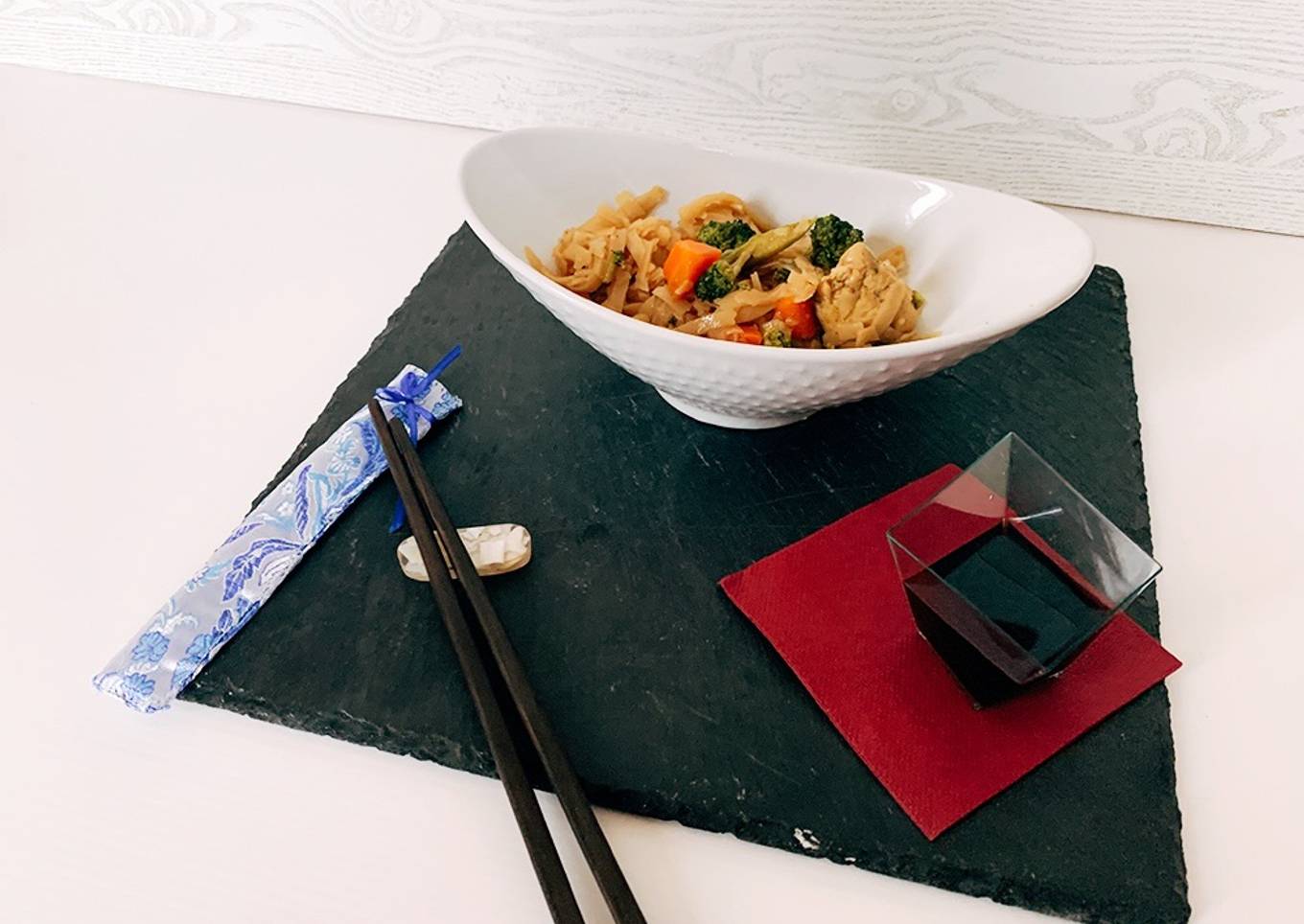 Noodles de arroz, pollo y verduras
