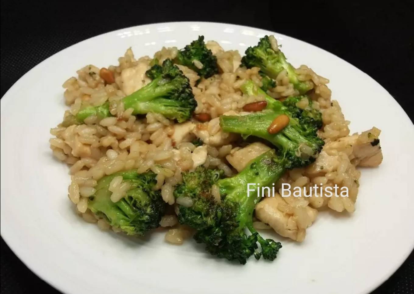 - Una vez la brócoli está salteada añadimos el pollo cocinamos por un minuto y añadimos los piñones y salpimentamos, incorporamos el arroz y la salsa de soja salteamos unos minutos(listo)