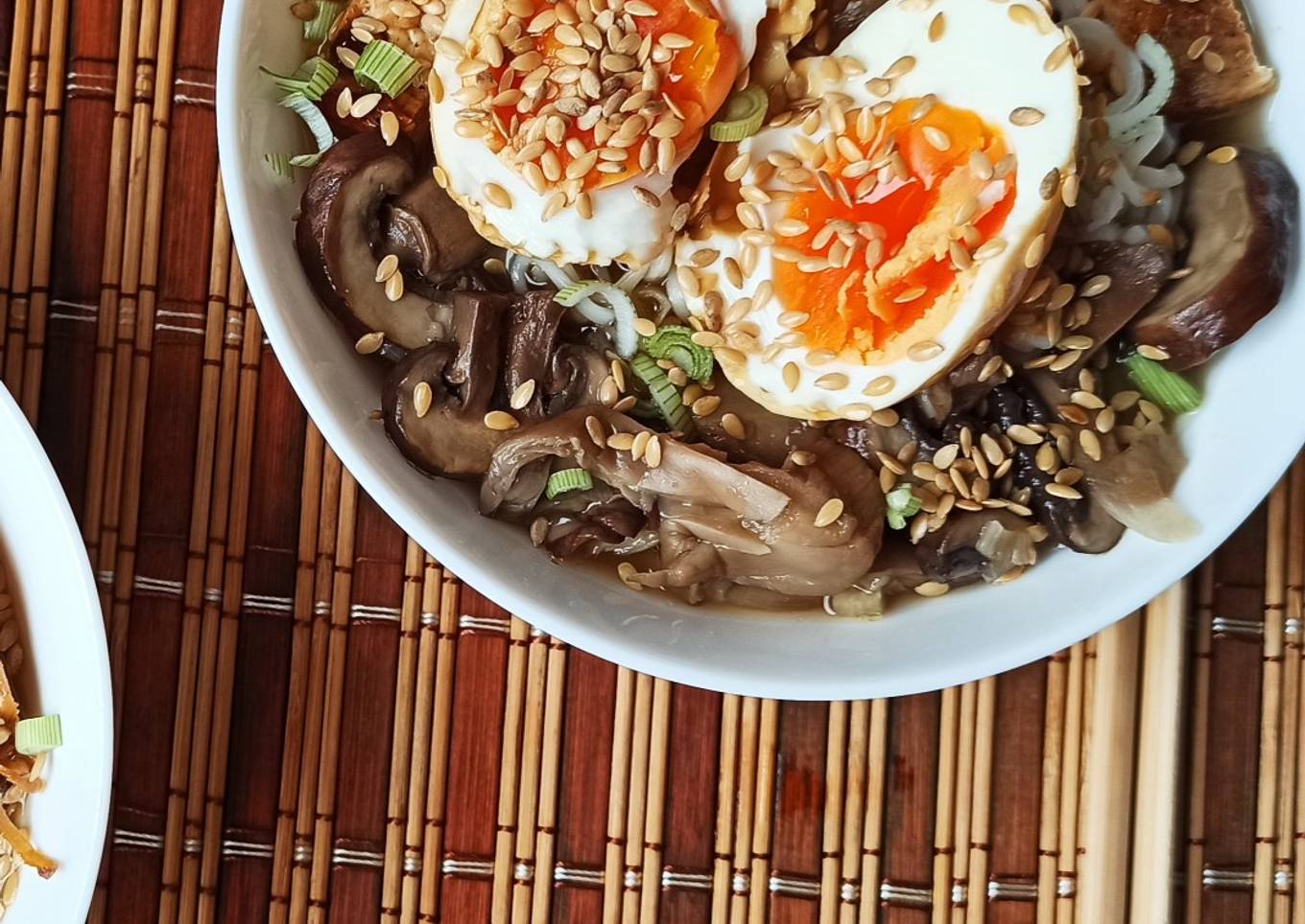 - Vamos a montar el bowl. Los noodles los pasamos por agua fría según terminen de cocerse para parar la cocción y cortamos el pollo en tiras. Repartimos los noodles en los bowls, colocamos las tiras de pollo en un lado, restamos unas setas y unos champiñones de caldo, añadimos caldo hasta cubrir, sacamos los huevos de su macerado y los colamos en medio y los cortamos. Ponemos por encima la parte verde de la cebolleta y unas semillas de lino.