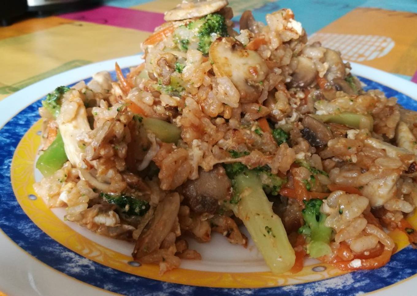 - Cortar todo en pequeños trozos o en juliana (depende del ingrediente) el arroz se debe de cocer antes al igual que el brócoli. Añadir en una sartén grande con aceite, un poco de tabasco, salsa de ostras y concentrado de tomate. Mover todo y que se mezclen bien los ingrediente y entonces añadir un huevo y seguir moviendo hasta que el huevo se haga y listo para engullir, no te quemes!!!!😉😈