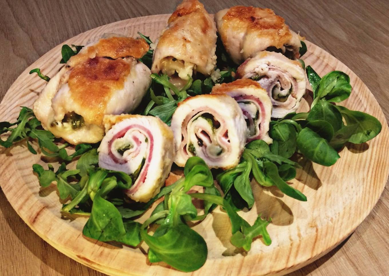 Rollitos de pollo con beicon, jamón y queso