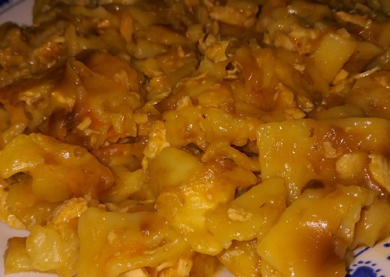 - Se sofríe la cebolla y después el tomate. Añadimos el pollo desmenuzado, sal, pimienta, y tomillo. Después una cucharita de pimentón. Le damos una vuelta y después el caldo del pollo.dejamos que se haga