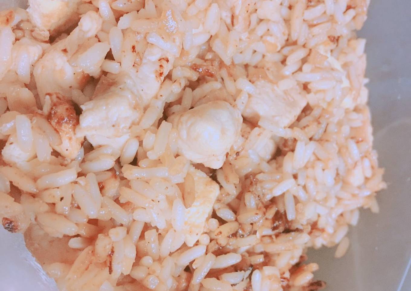 - Una vez esté listo el pollo, añadimos la tortilla y el arroz.... mezclamos bien y echamos un chorrito generoso de salsa de soja.