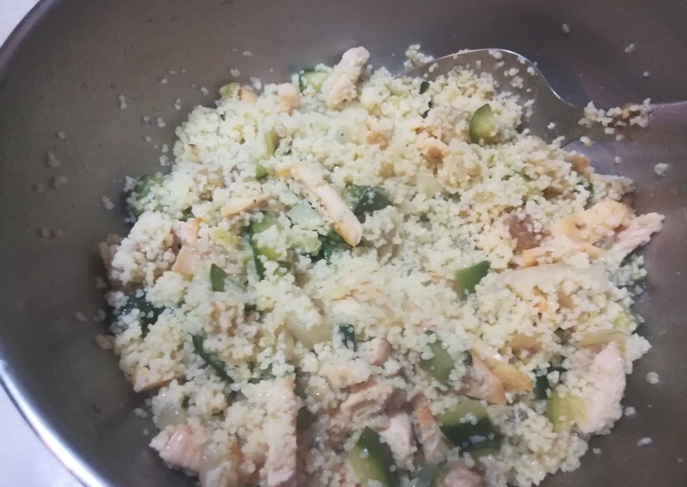 - Añadimos el pollo y las verduras al cuscus y ya podemos servir.