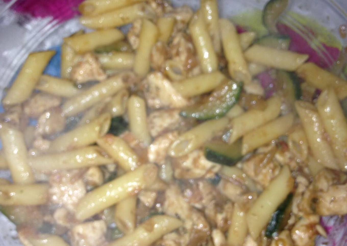 - En una sartén ponemos una cucharada de aceite de oliva y ponemos la cebolla a pochas cuando ya esté bien echa ponemos el calabacín con una pizca de sal y lo tapamos para que se haga bien,cuando este todo bien pochadito añadimos la pechuga salpimentada y una pizca de orégano,vamos removiendo bien y cuando esté lista añadimos el tomate rallado,cuando este bien echo le añadimos los macarrones escurridos y lo mezclamos todo bien y listo