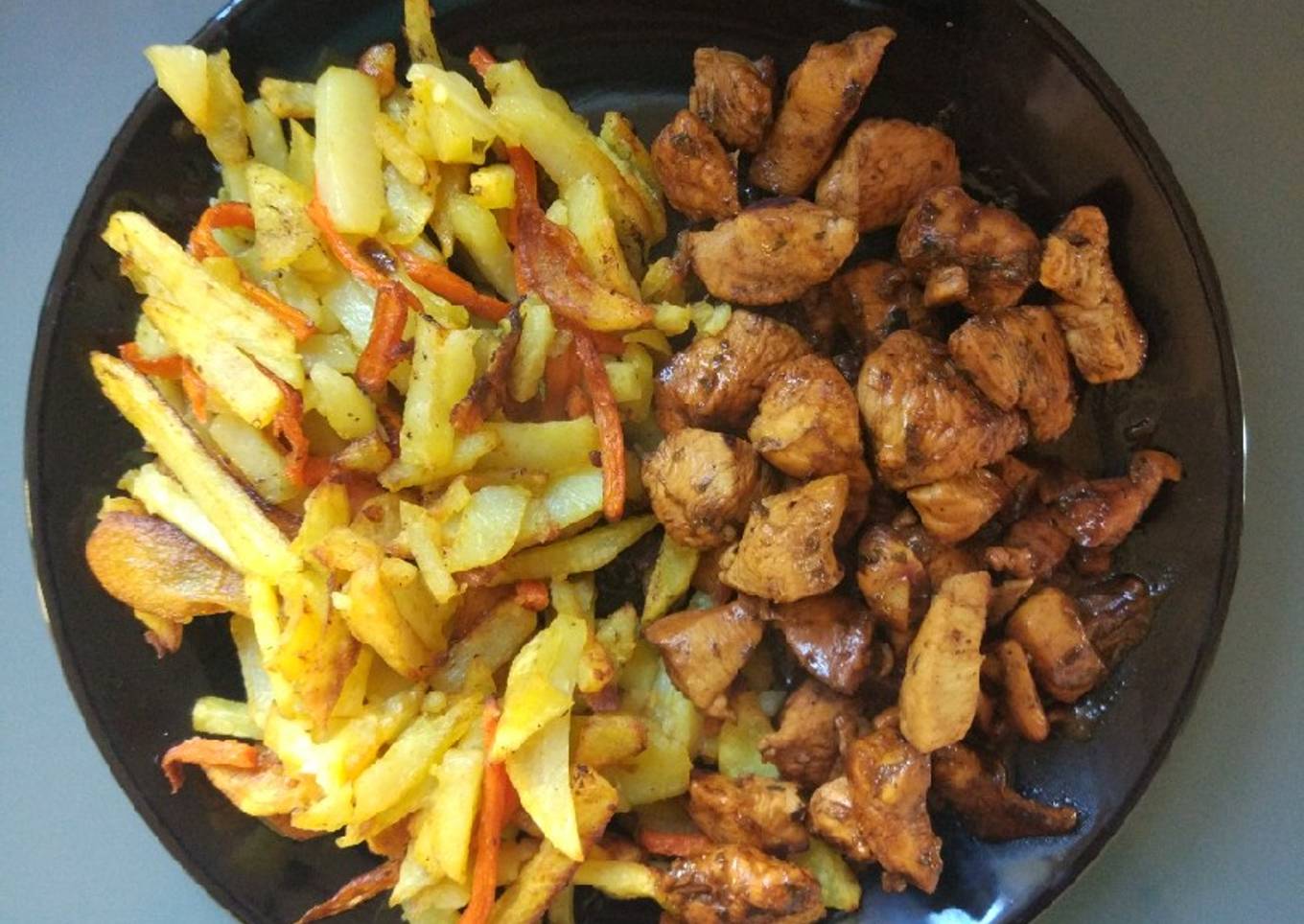 Receta improvisada (para variar). El pollo queda con un toque a limón buenísimo, y añadir las zanahoria a las patatas fritas es una mezcla genial!