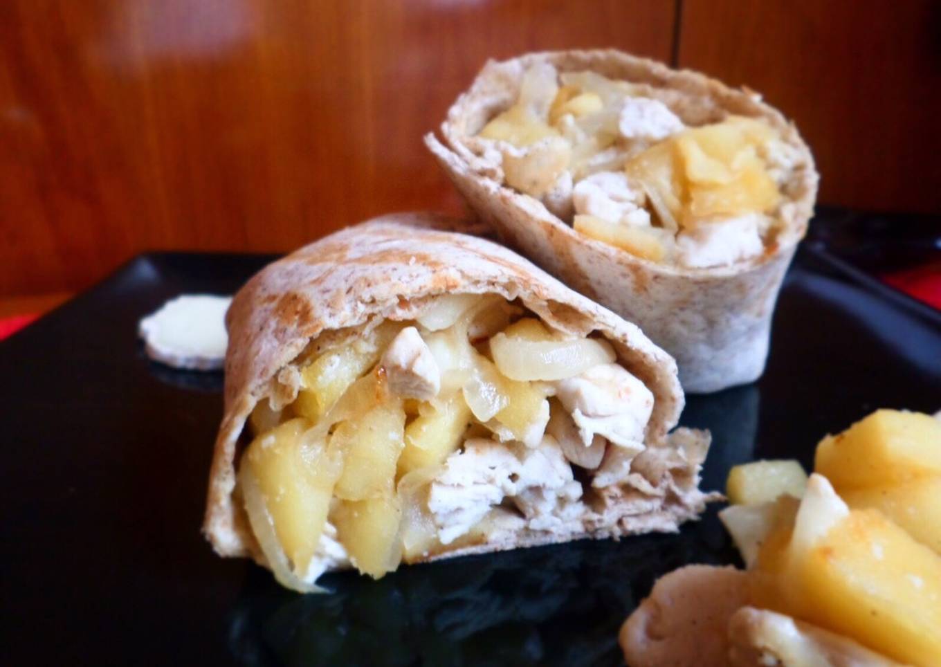 Wrap de pollo con queso de cabra y manzana caramelizada